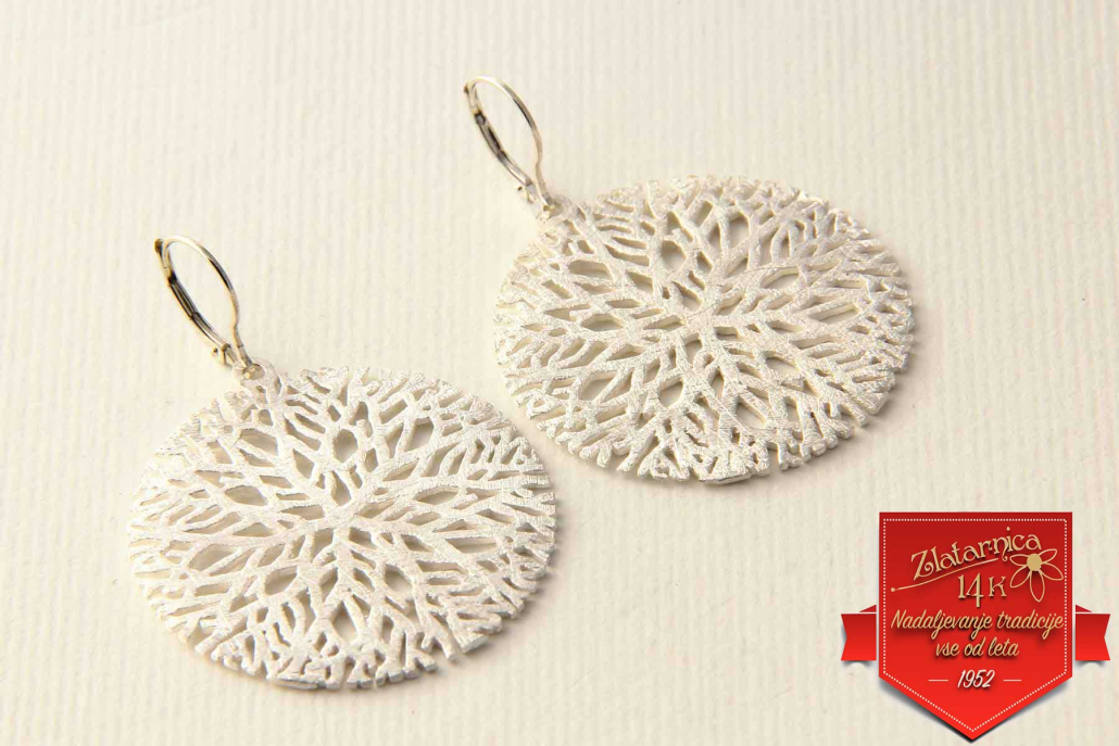 Viseči srebrni uhani z matiranimi vzorci v krogu spredaj in poliranim zadaj, ki spominjajo na snežinko .Prepletajoči liki ustvarjajo posebno elegantnco.