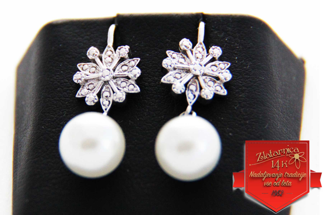Viseči uhani v obliki snežink z belimi biseri. Biseri so imitacija in so zato zelo lahki in prijetni za nošenje.