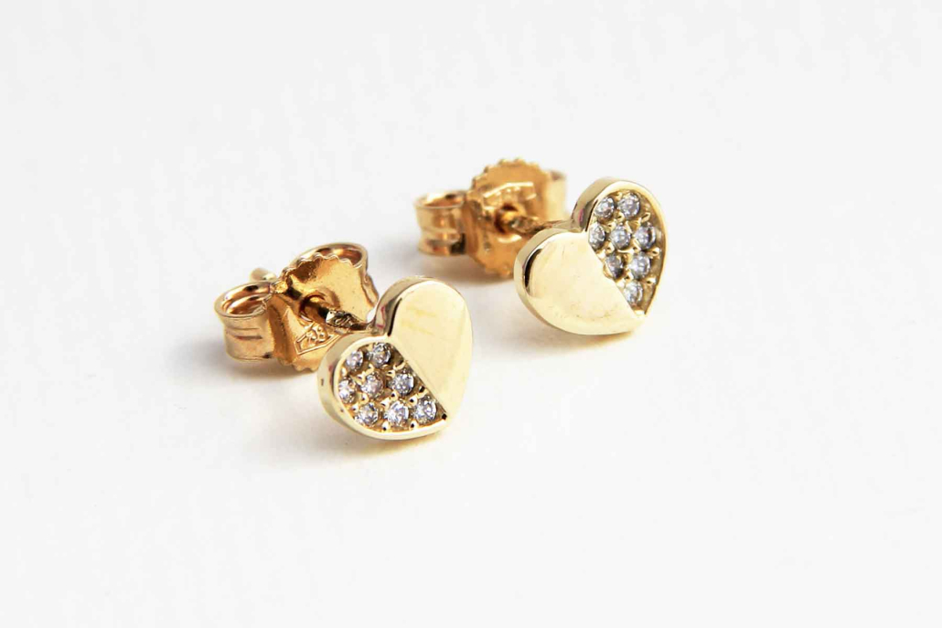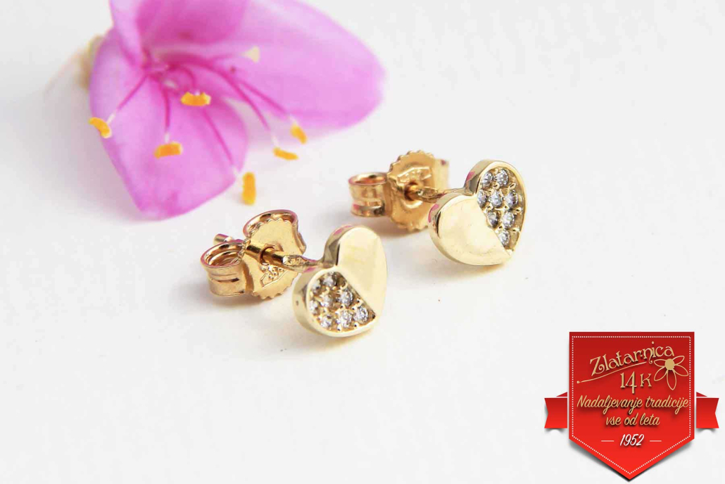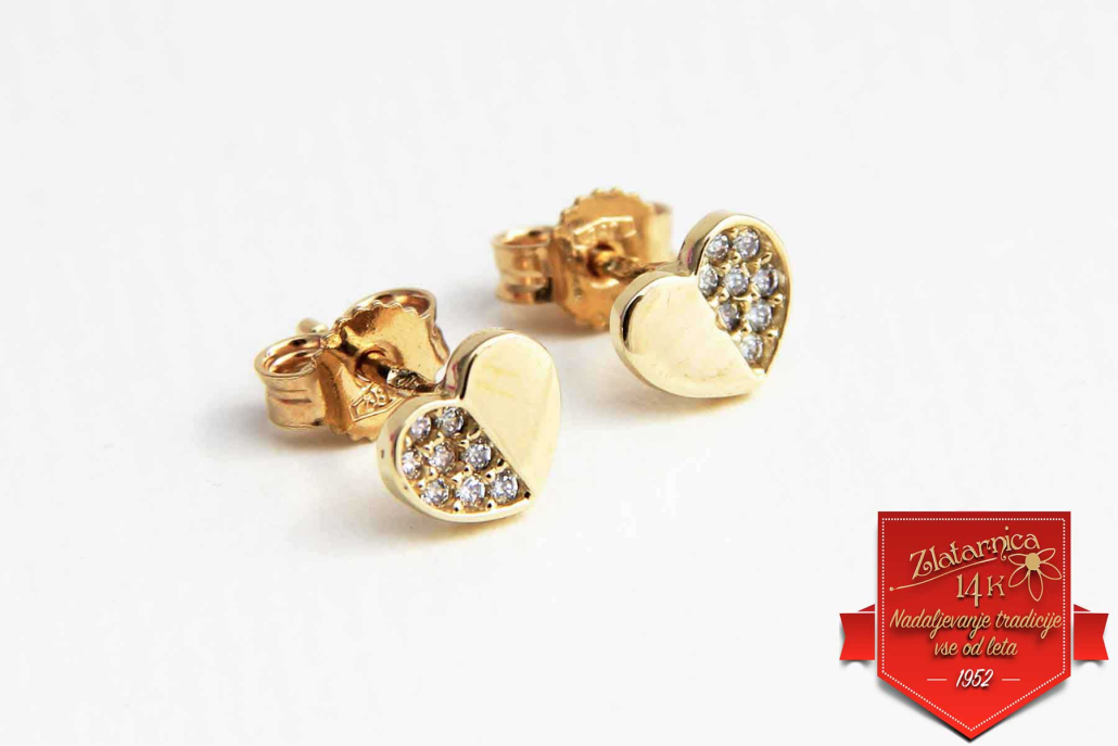 Uhani v obliki srčkov iz rumenega zlata, s vkovanimi cirkoni na eni polovici.