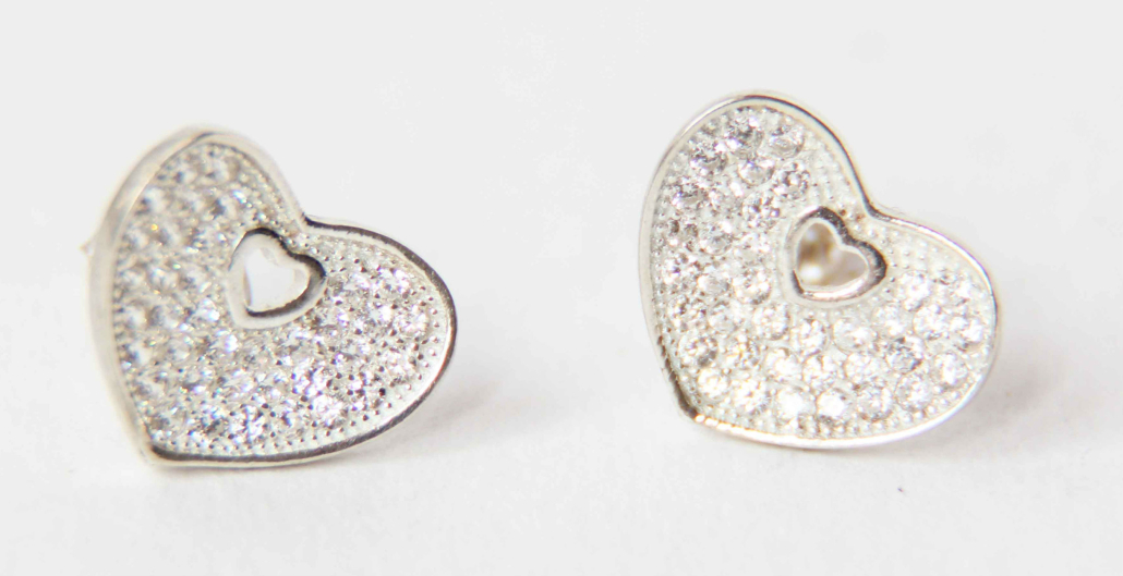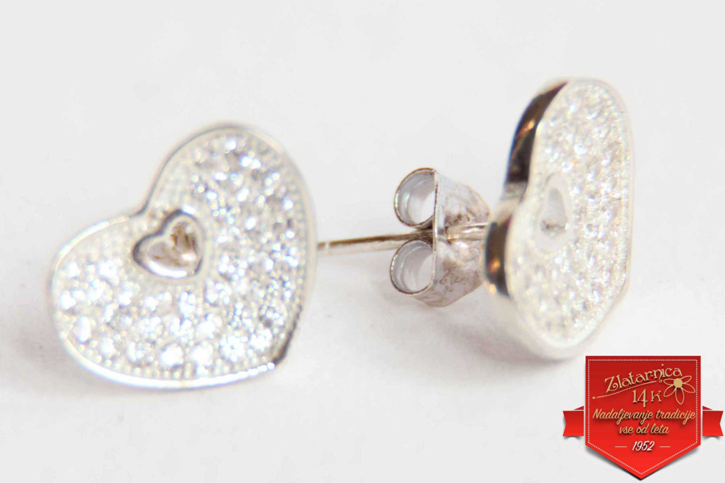 Srebrni uhani v obliki srca, posuti s cirkoni.