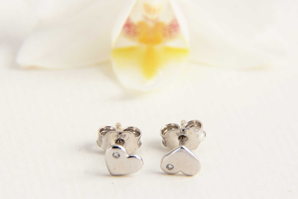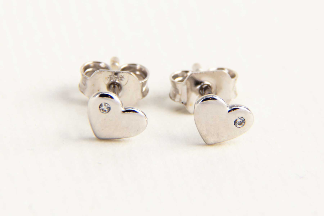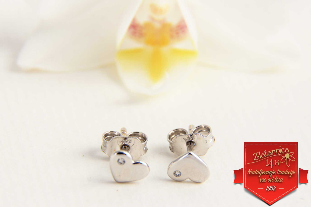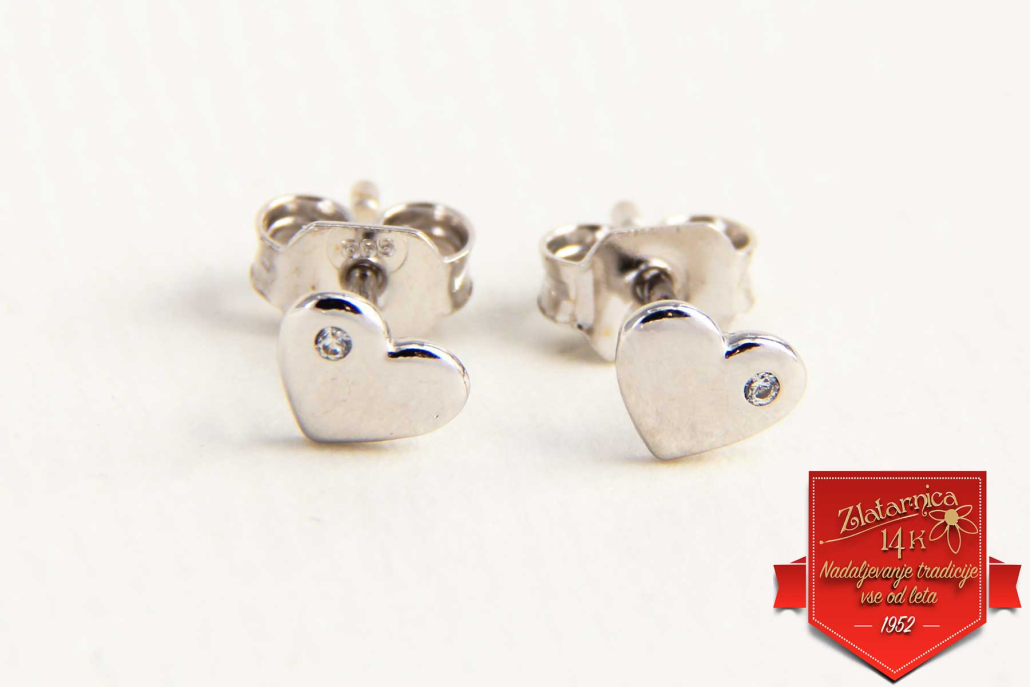 Uhani v obliki gladkih srčkov iz belega zlata, s vkovanim cirkonom v zavoju.