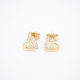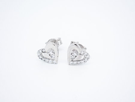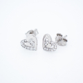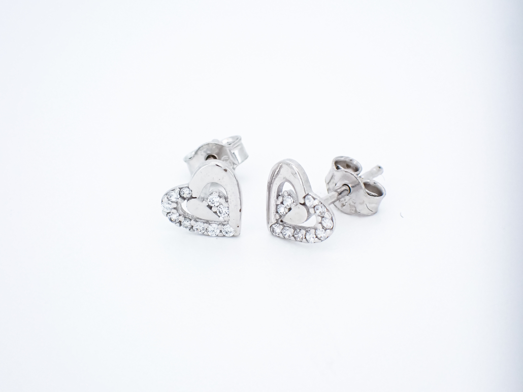Uhani v obliki povezanih srčkov iz belega zlata, s vkovanimi cirkoni na polovici.
