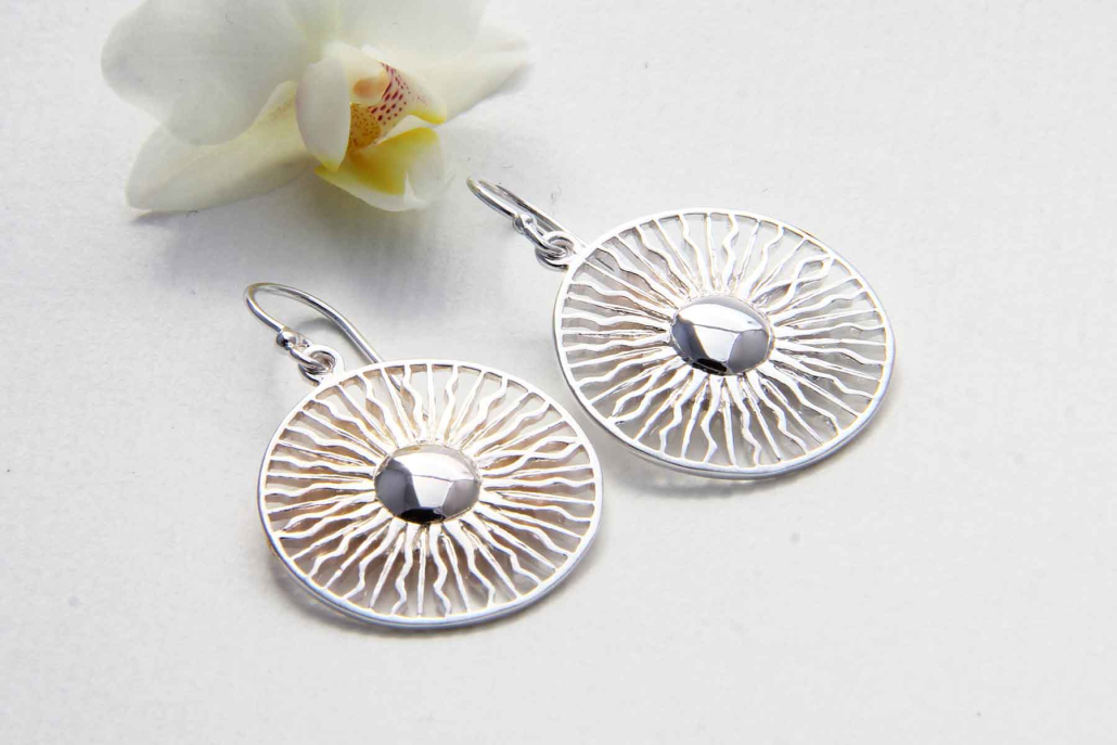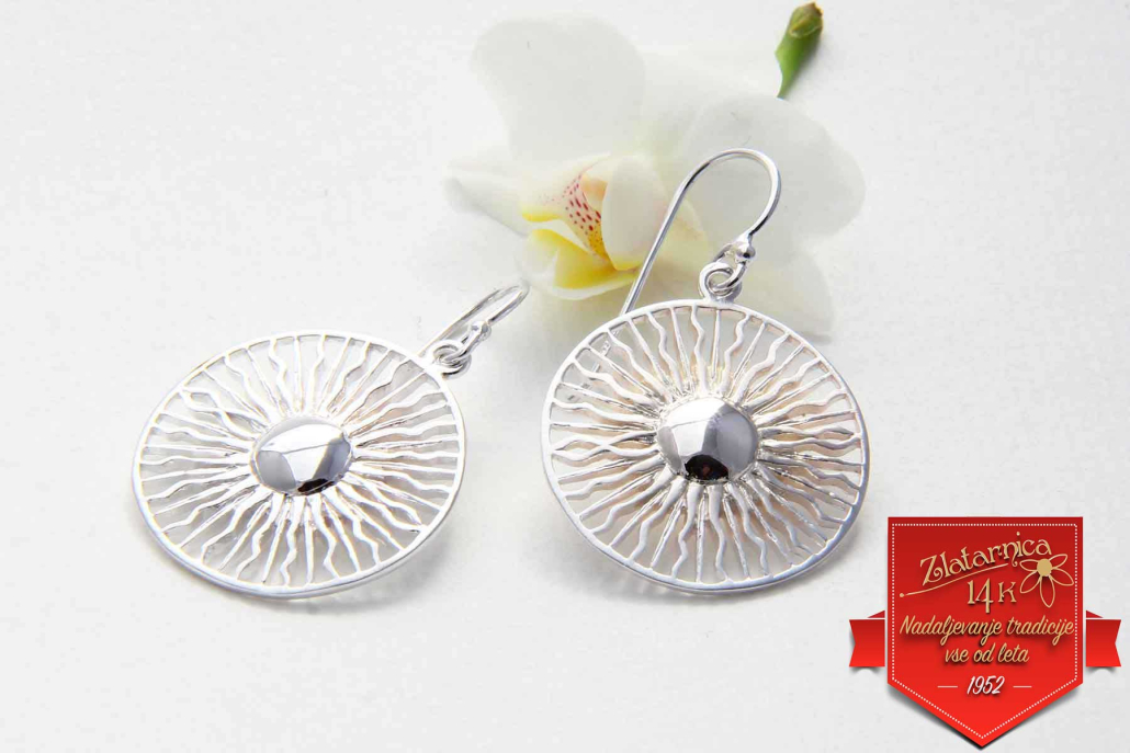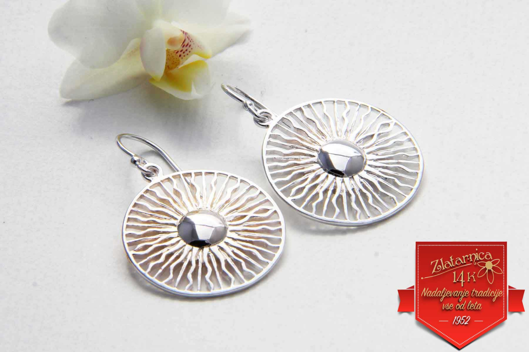 Srednje veliki srebrni uhani z matiranimi žicami v krogu, ki spominjajo na sonce.Prepletajoči liki ustvarjajo posebno elegantnco.