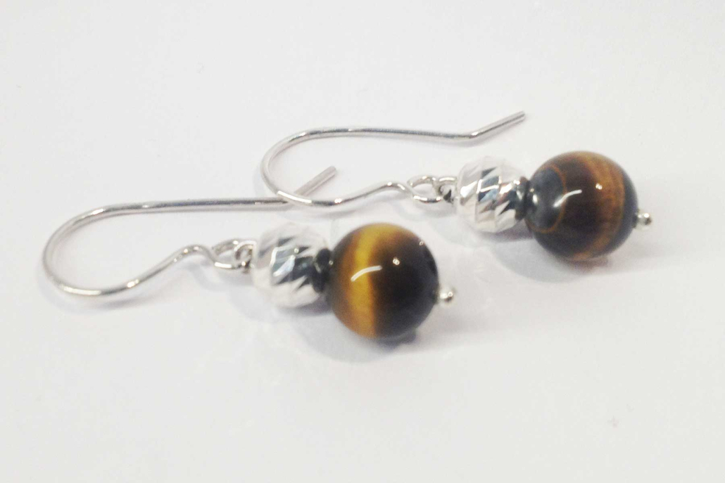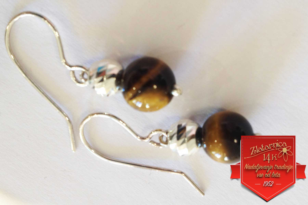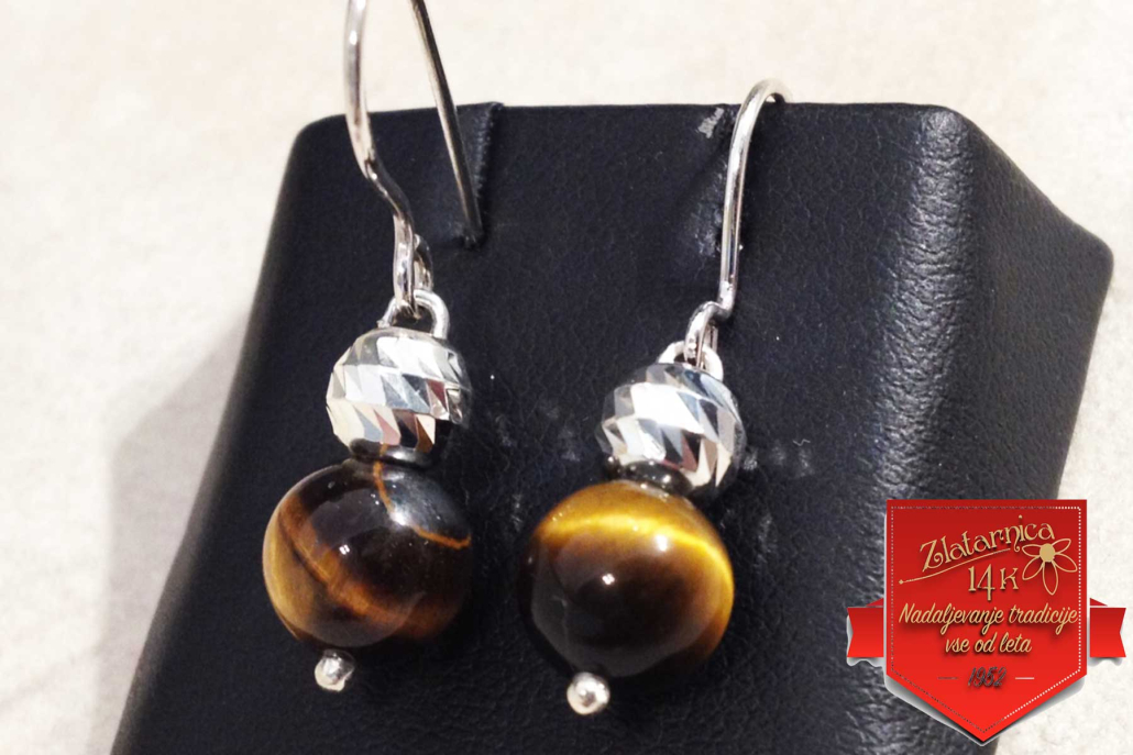 Viseči srebrni uhani z poldragim kamnom tigrovo oko in bunkico.