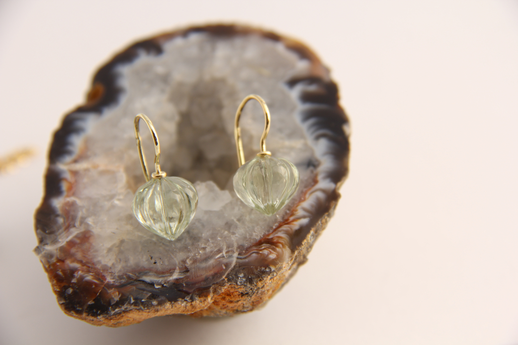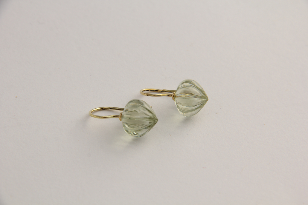 Unikatni, ročno izdelani uhani iz rumenega zlata na kavelj, z naravnim zelenim granatom brušenega v obliko lampijona.