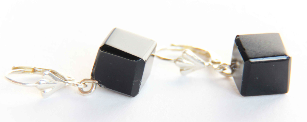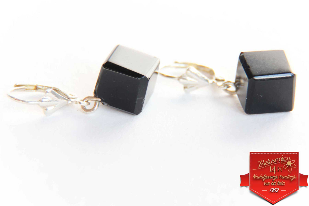 Ročno izdelani srebrni uhani z oniksom v obliki kocke.