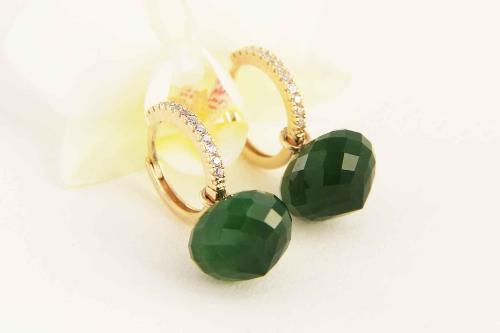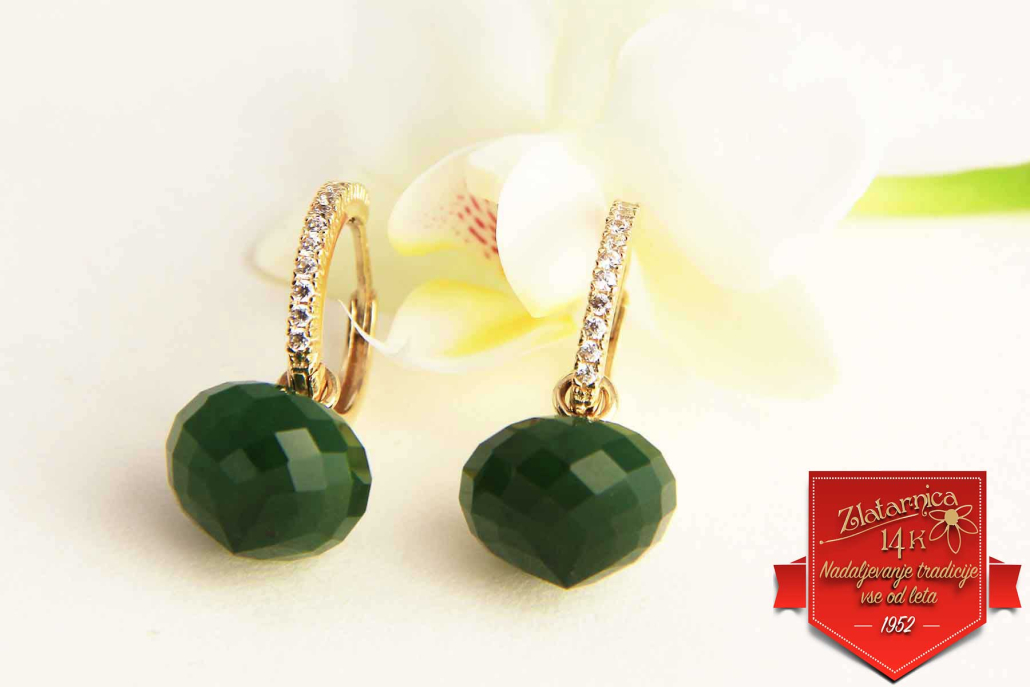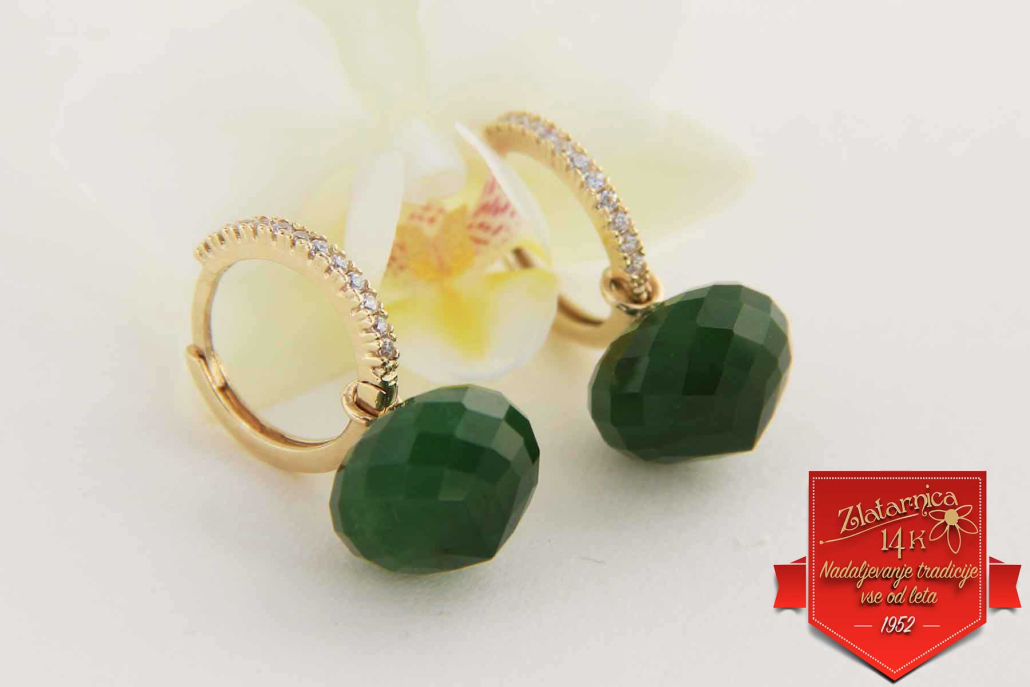 Unikatni viseči uhani z obročkoma iz rumenega zlata okovanima s cirkoni in visečimi zelenimi žadi čebulnega brusa.