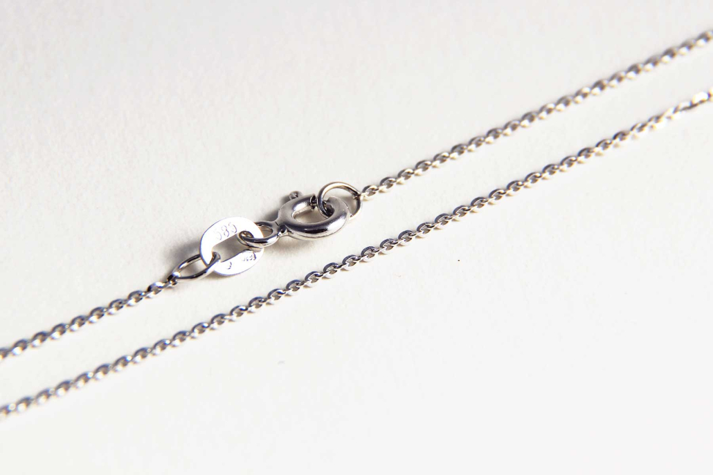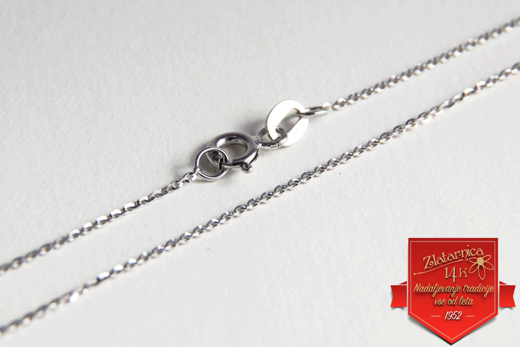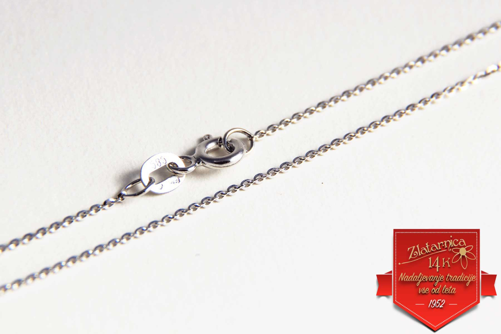 Verižica iz belega zlata, ki jo sestavljajo drobni členi, vezani v vezu anker.