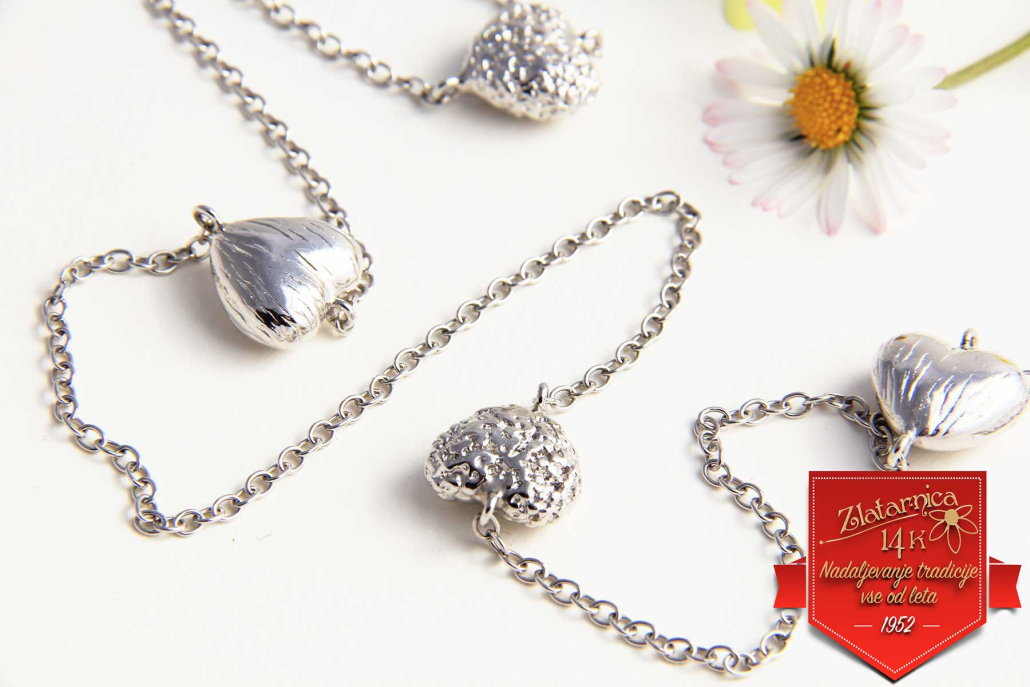 Modna, zelo dolga srebrna verižica vzorca anker z vstavljenimi srčki, ki so različno obdelani in se izmenjujejo.
