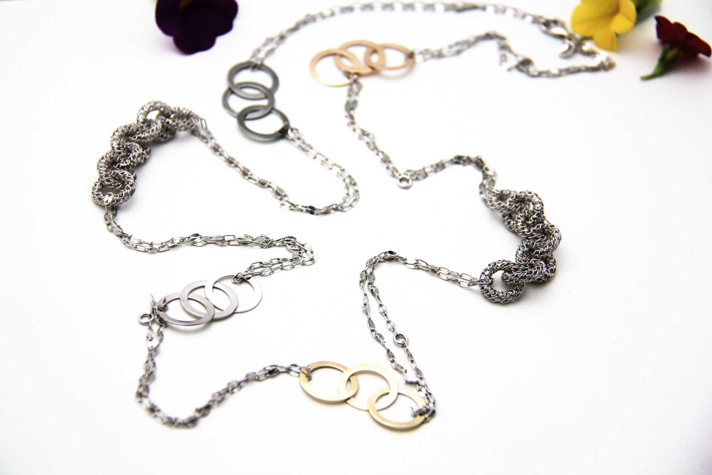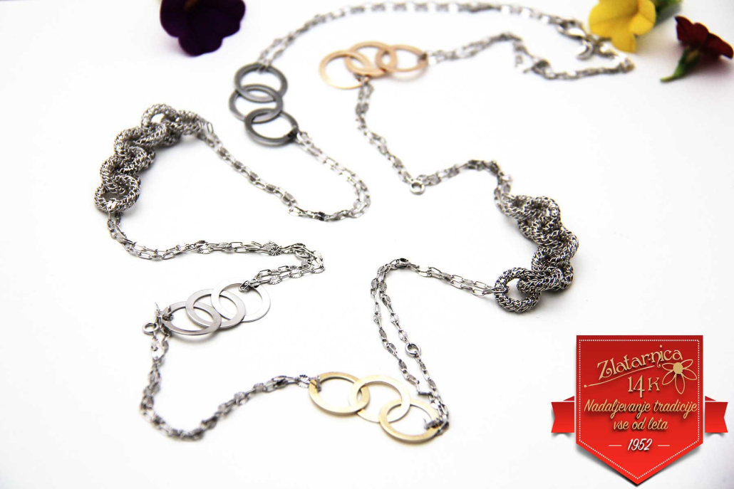 Modna, zelo dolga srebrna verižica vzorca kavnih zrnc z vstavljenimi gladkimi obročki z roze, rumeno pozlato in brez, ter mrežastimi obročki.
