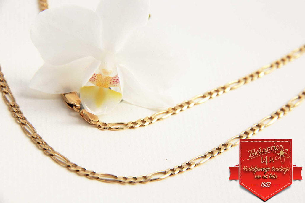 Masivna verižica iz rumenega zlata sestavljena iz daljših in krajših členov, ki se med seboj izmenjujejo.