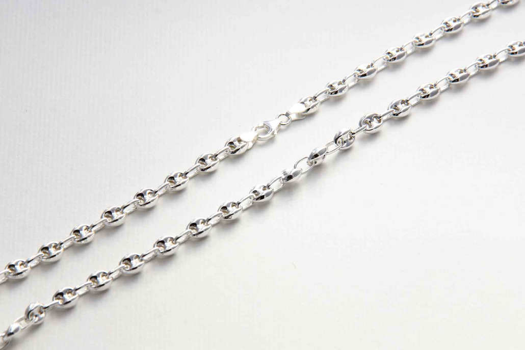 Srebrna verižica iz ovalnih vzdolžnih členov, ki spominjajo na zrno kave.