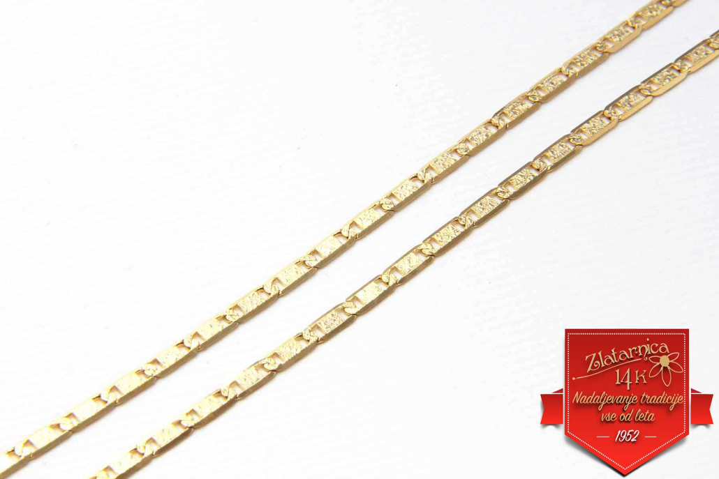 Verižica iz rumenega zlata, ki jo sestavljajo podolgovati matirani členi, ki so po robovih brušeni in se svetijo.