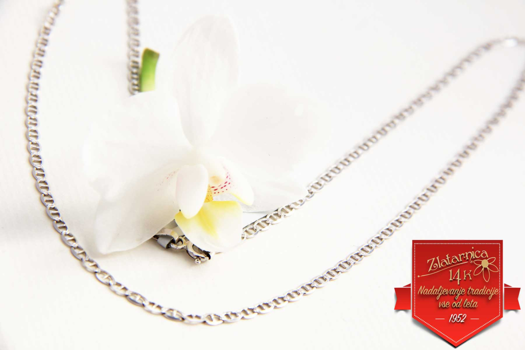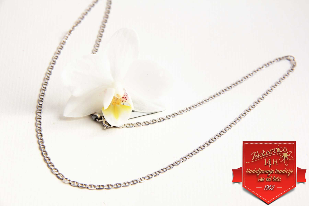 Verižica iz belega zlata, sestavljena iz ploščato brušenih ovalnih členov, s prečno palčko v sredini.