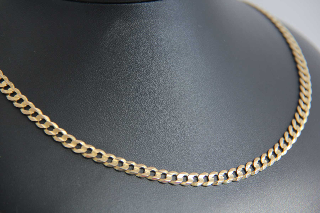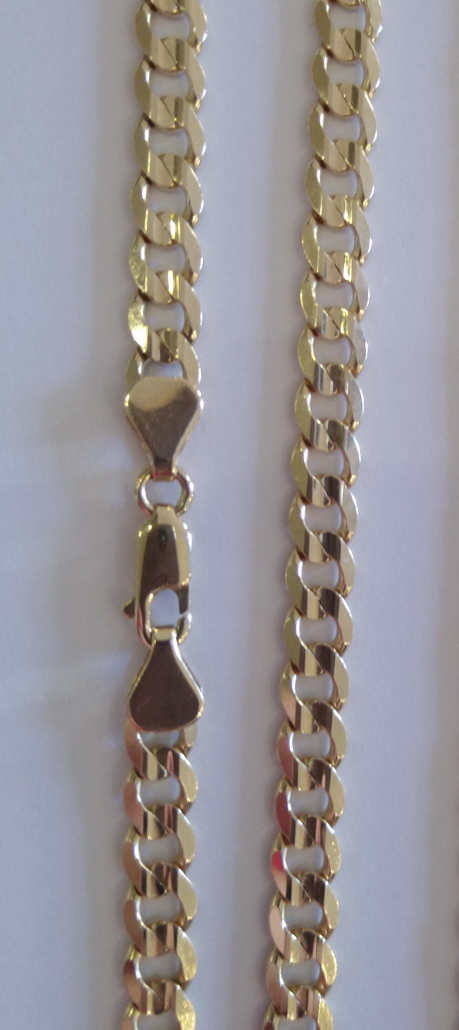 Masivna, klasična moška verižica iz rumenega zlata v vezu žlebasti pancer. Zapira se z močnim karabinerjem.