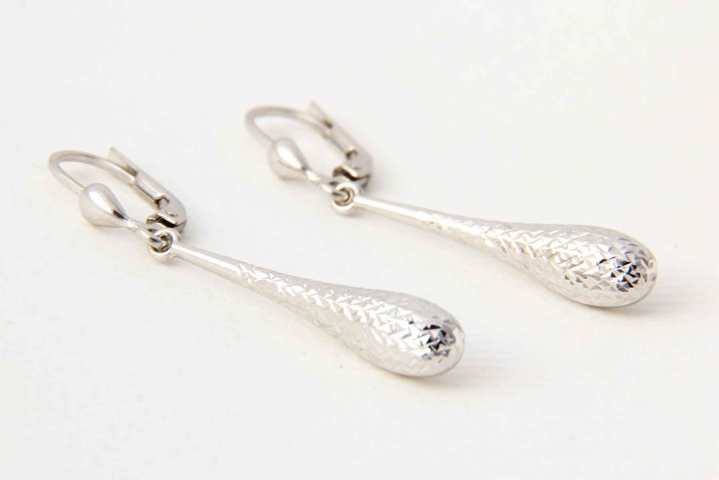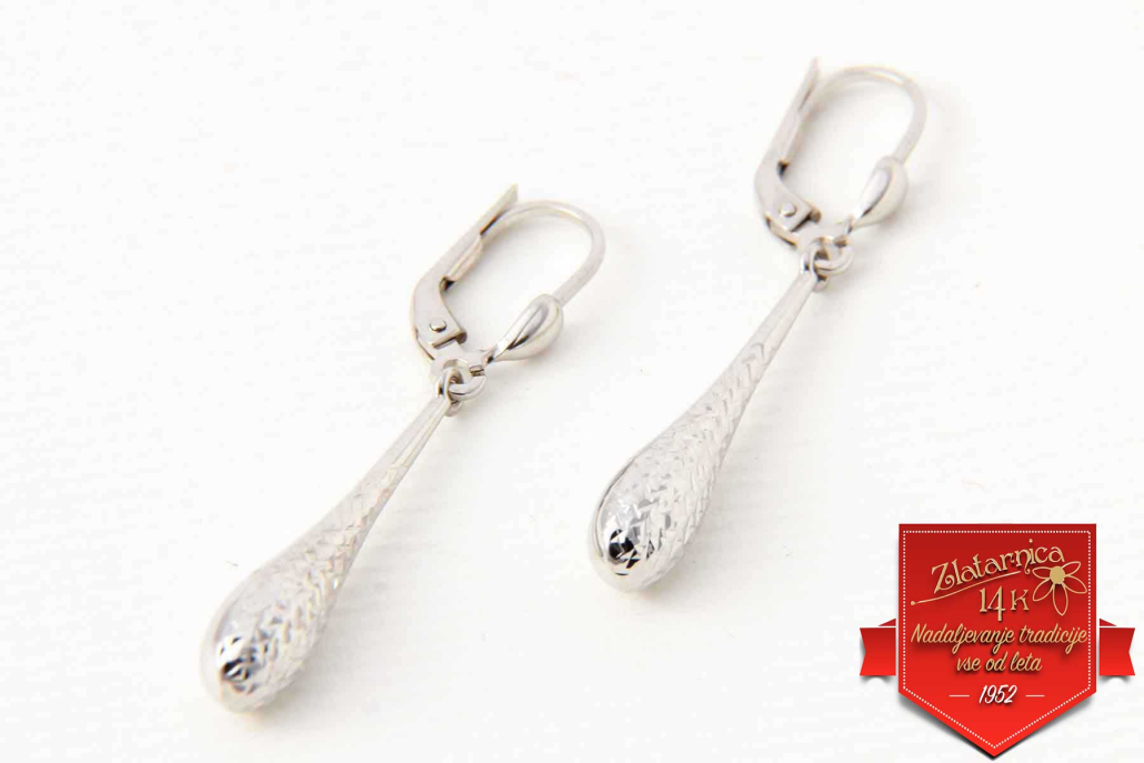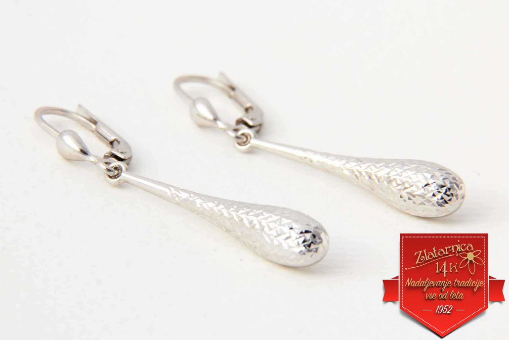 Viseči uhani iz belega zlata v obliki kapljicez bleščečo gravuro spredaj. Zapirajo se na viseči patent.