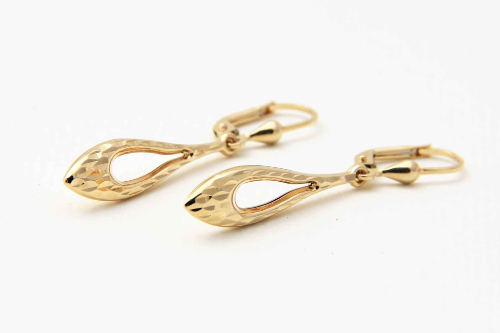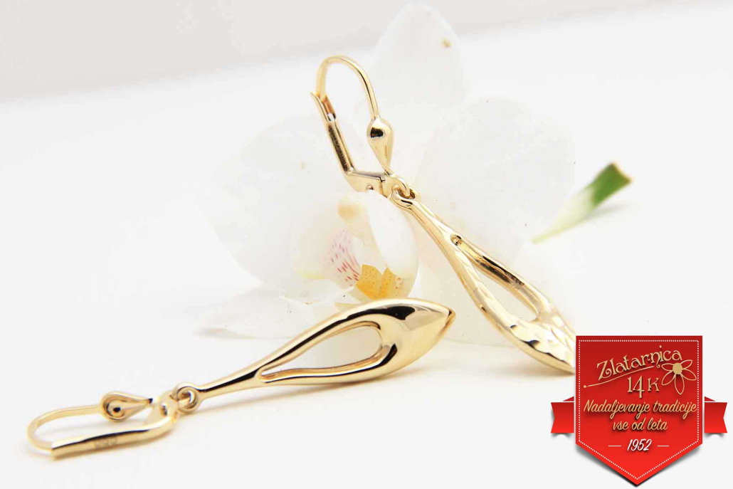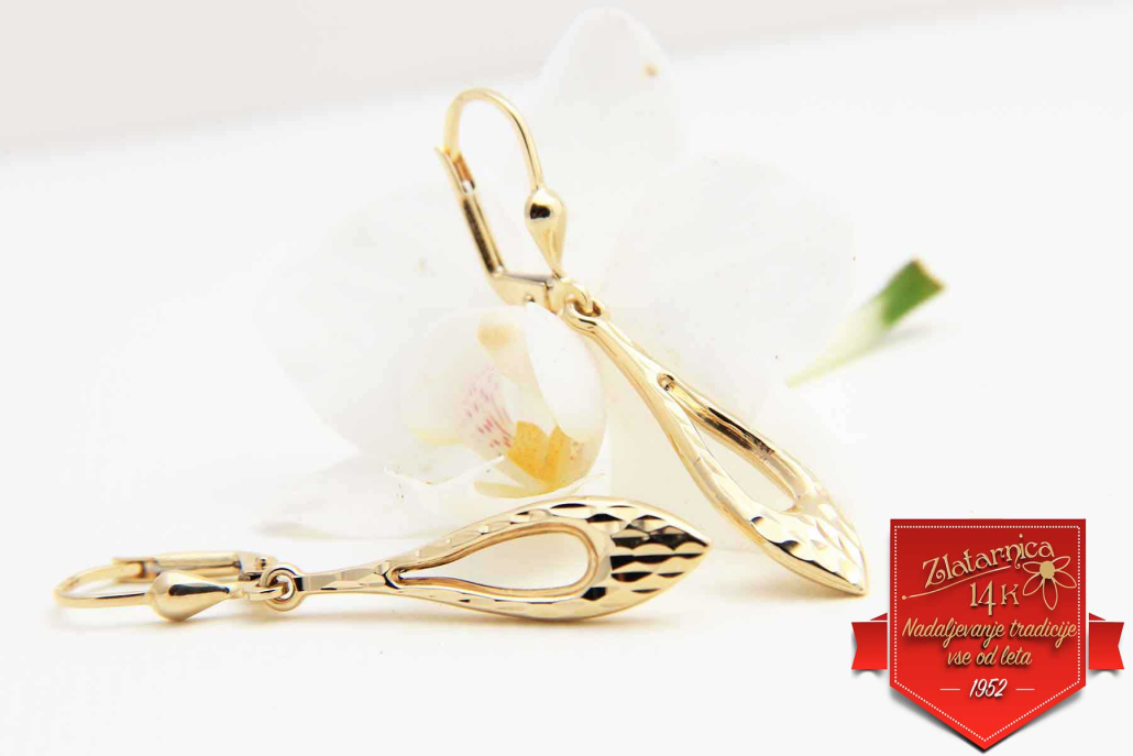 Viseči uhani iz rumenega zlata v obliki kapljicez bleščečo gravuro spredaj. Zapirajo se na viseči patent.