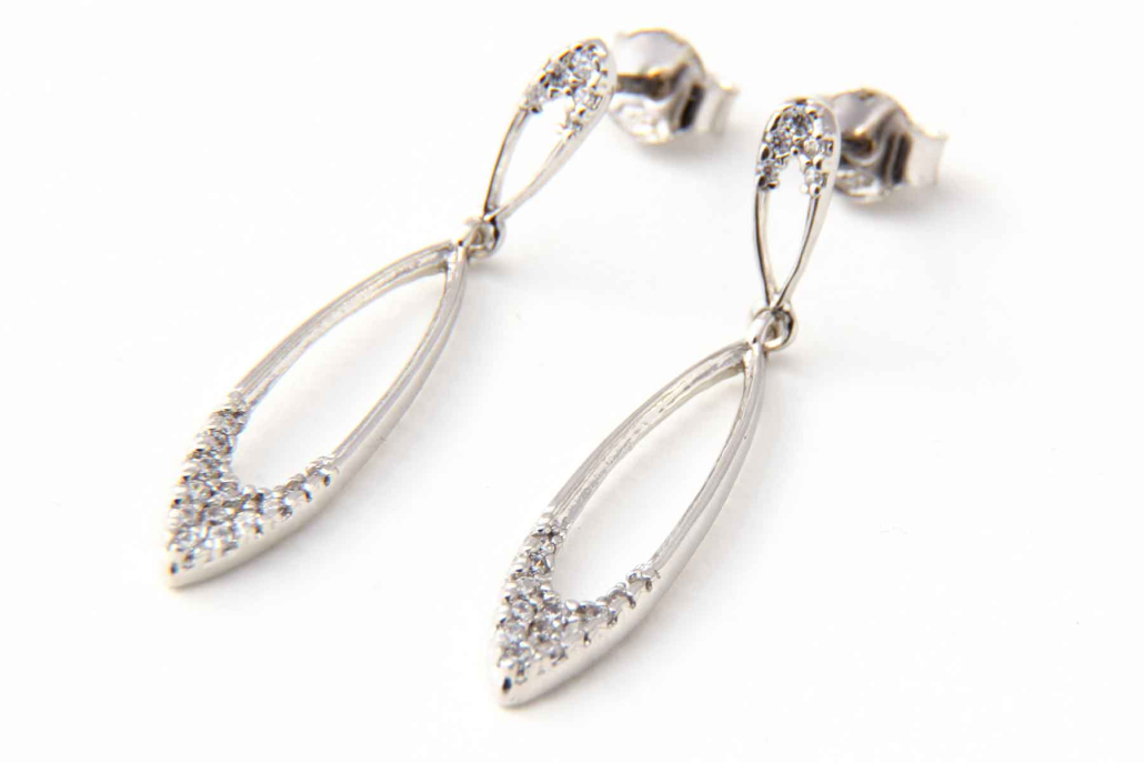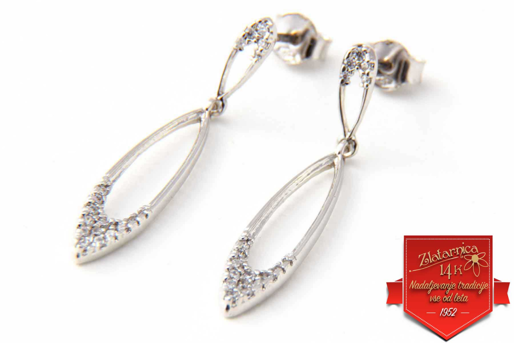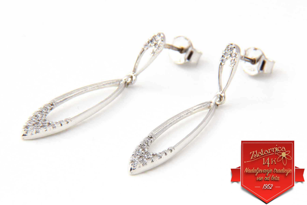 Viseči uhani v obliki čolnička iz belega zlata s cirkoni.