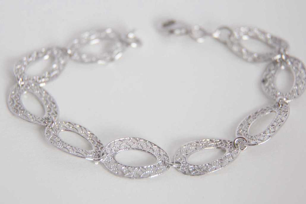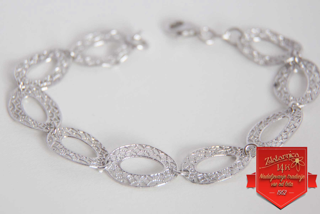 Srebrna zapestnica sestavljena iz velikih ovalnih ploščic z izrezljanimi vzorci. Zapira se s karabinerjem.