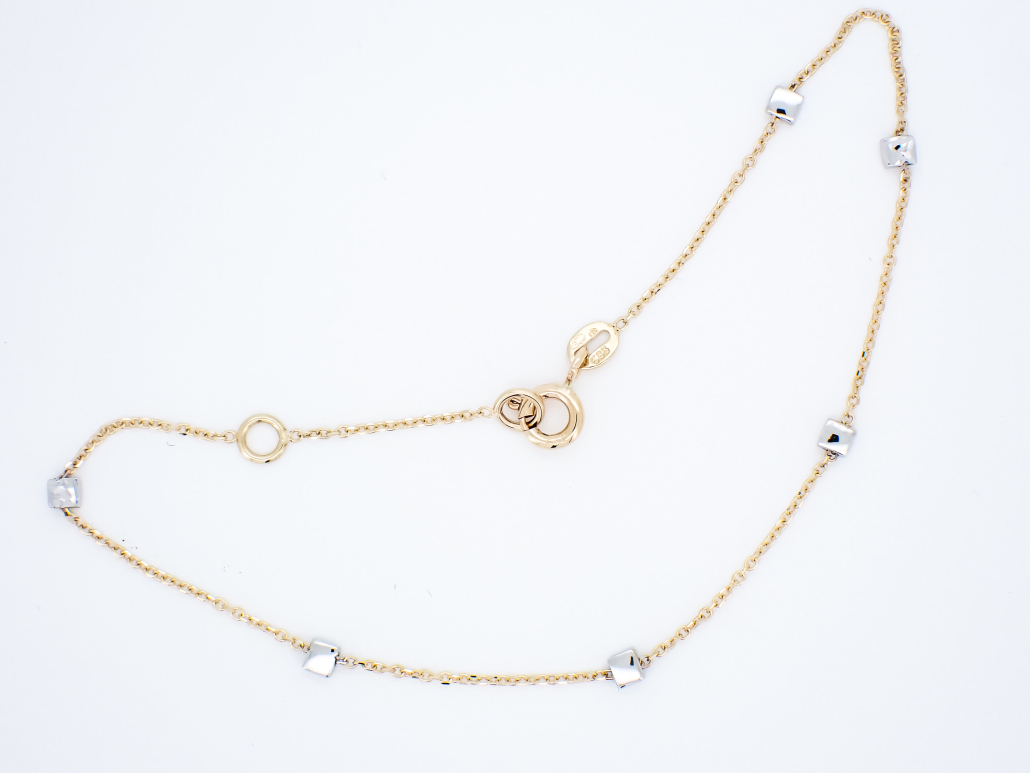 Ljubka zapestnica iz kombinacije rumenega in belega zlata z kockami.