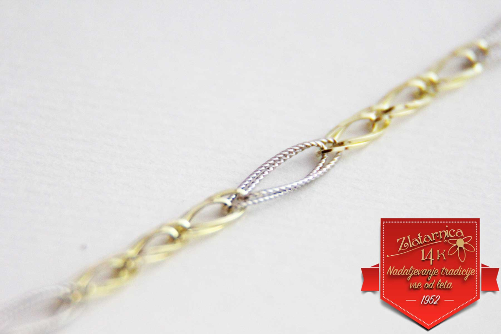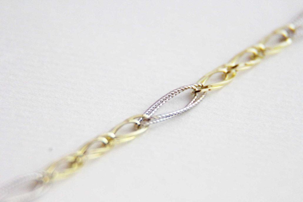 Prefinjena ročno izdelana zapestnica iz kombinacije belega in rumenega zlata. Dvojno pleteni mali ovalni členi so iz rumenega zlata s polirano površino in so povezani z večjmii členi iz zavite žice iz belega zlata.