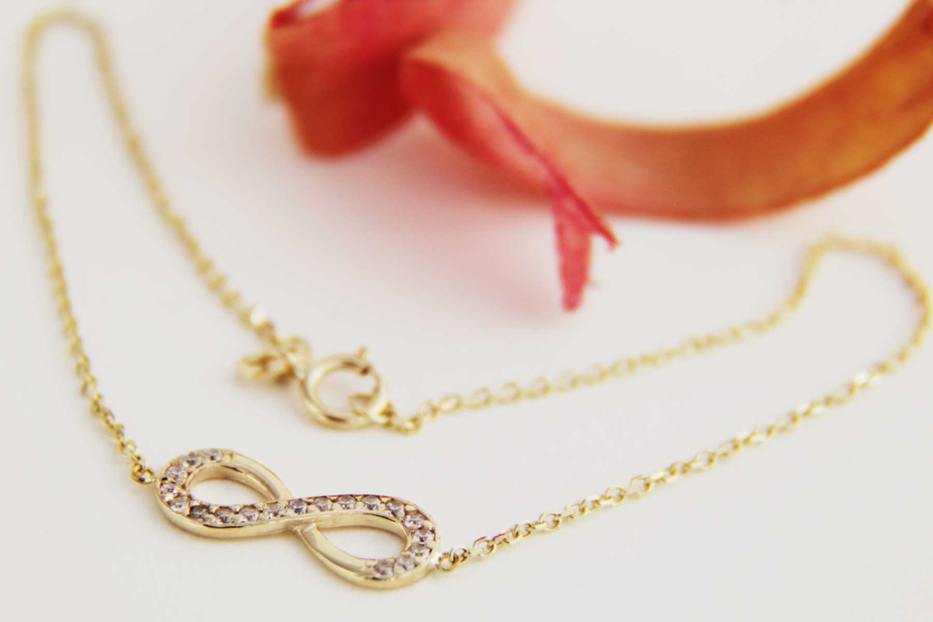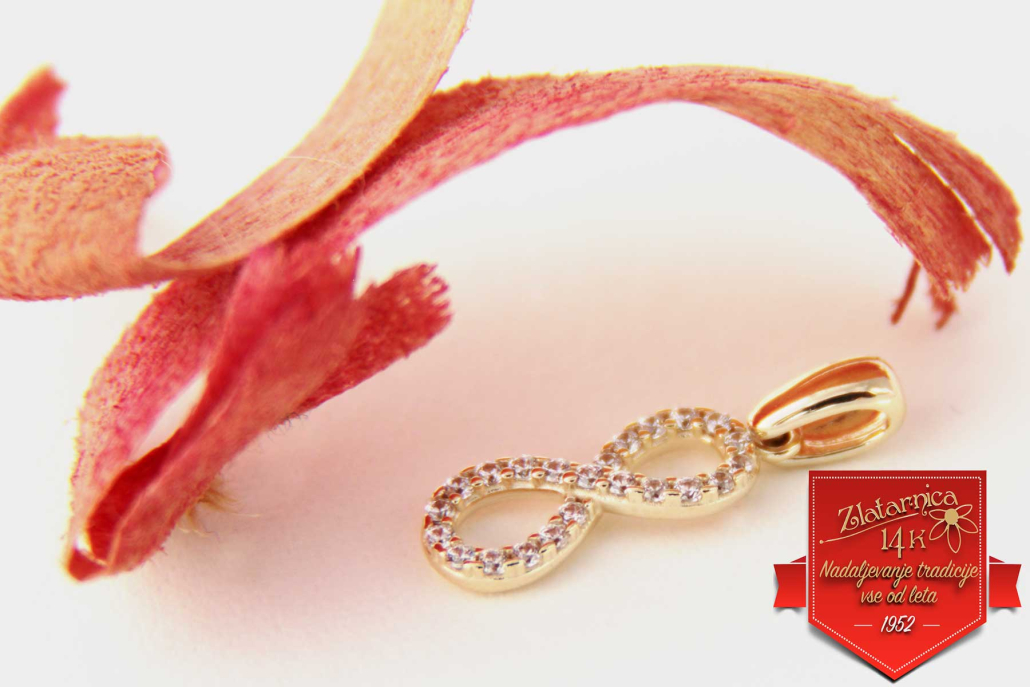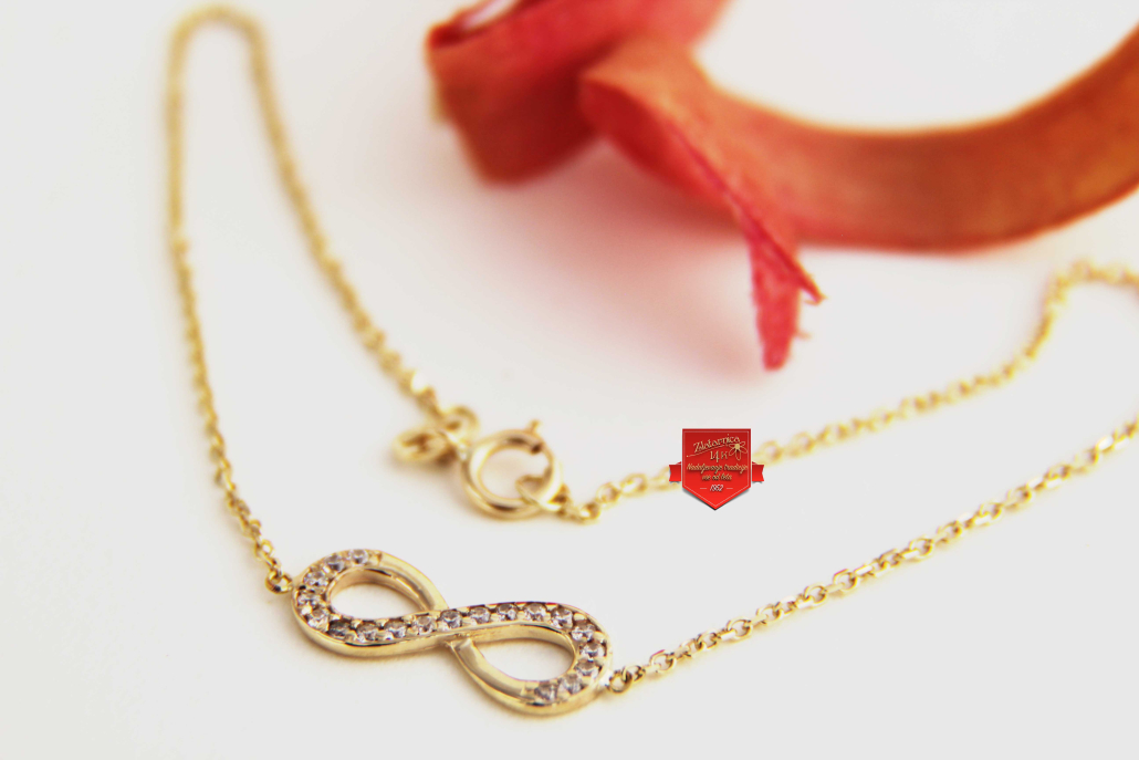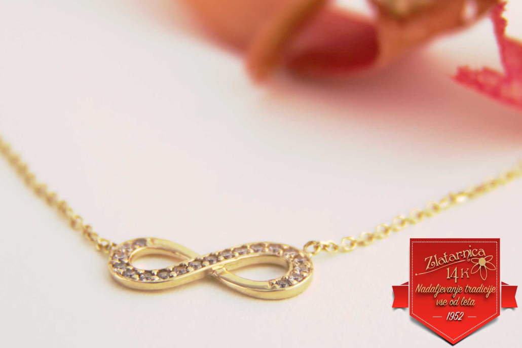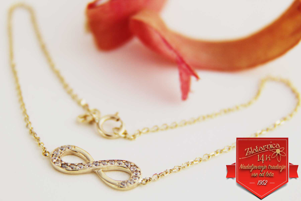 Zapestnica iz rumenega zlata vzorca anker z osmico, ki je znak za neskončnost, večnost, nekaj, kar se ne konča. Zapestnico lahko kombinirate z enakimi uhani, verižico, ki ima vstavljeno osmico ali samostojnim obeskom in prstanom.