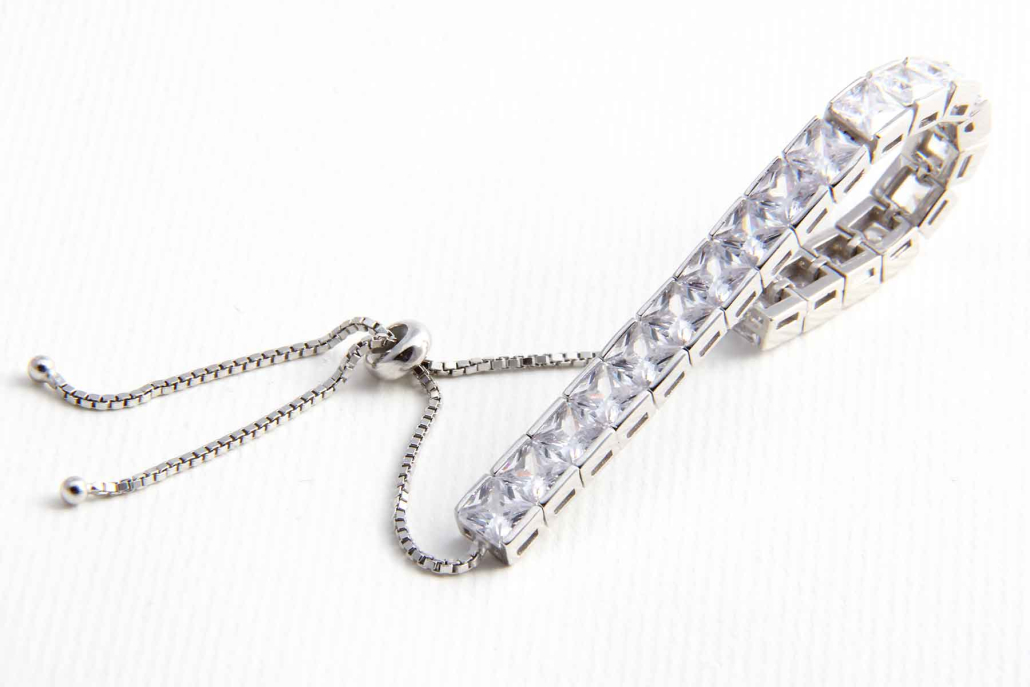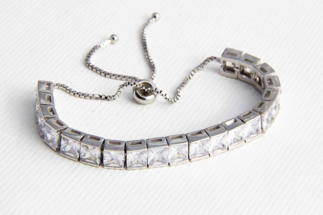 Tenis zapestnica sestavljena iz zaporedno povezanih kvadratnih kamnov z verižico in z drsnim elementom, ki ga lahko poljubno zategnete.