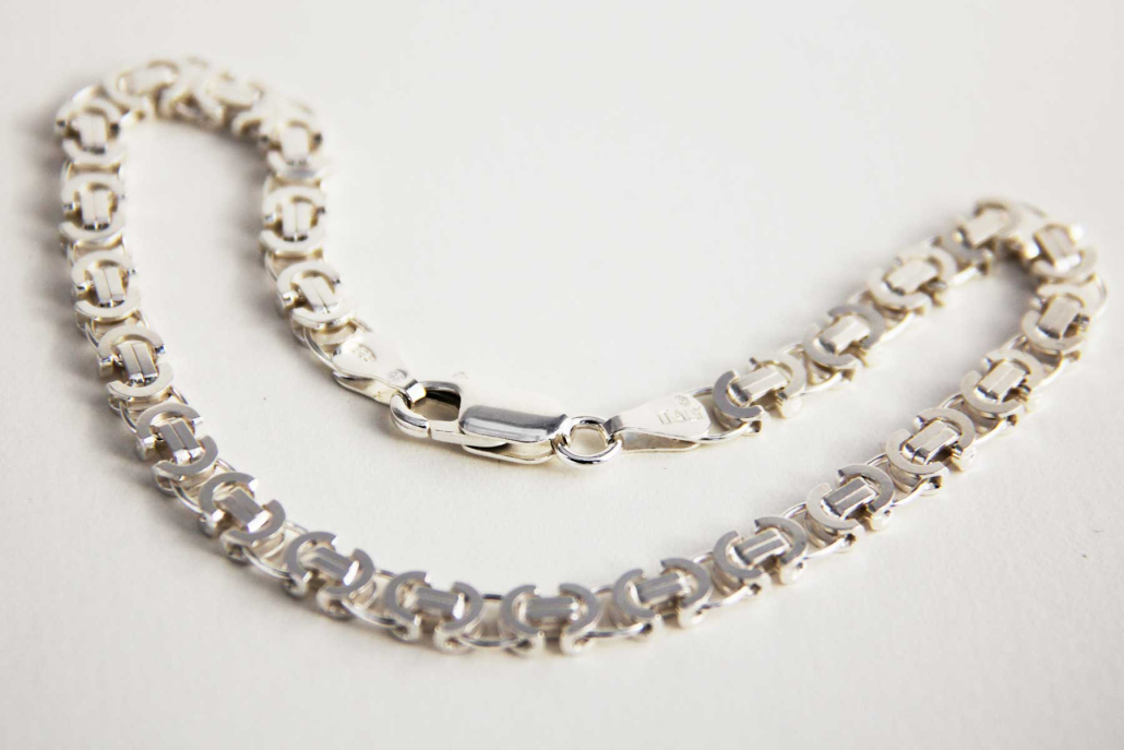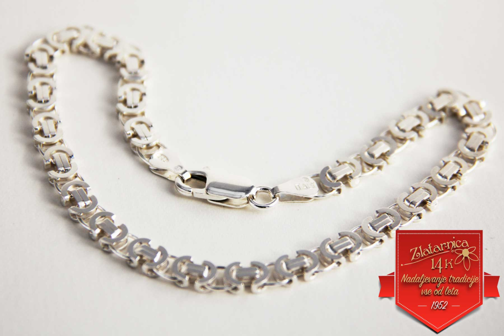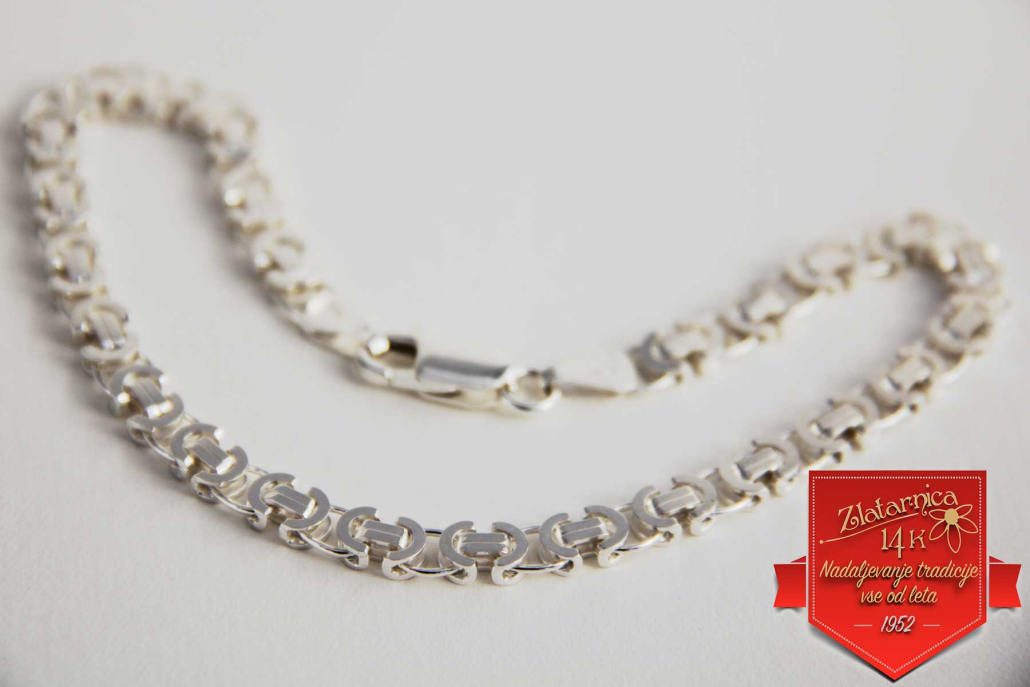 Masivna moška srebrna zapestnica s členi, povezanimi v ploščati kraljevi vez.