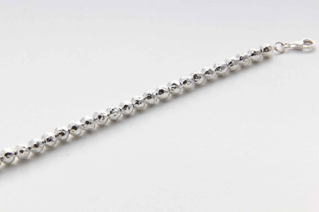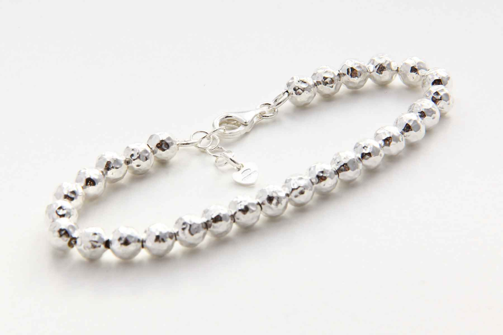 Srebrna zapestnica sestavljena iz tolčenih kroglic nanizanih na verižico. Zapira se s karabinom, njeno dolžino lahko prilagodite.