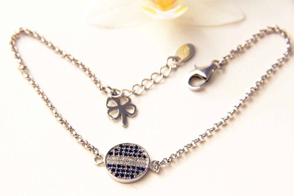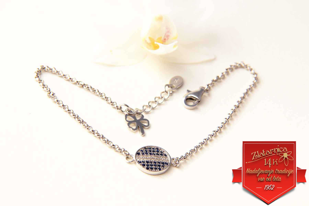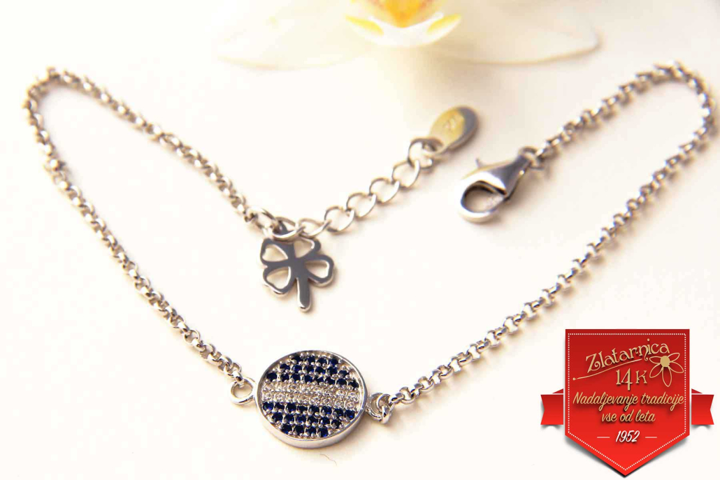 Zapestnica iz srebra z okroglo ploščico okovano modrimi in prosojnimi kamni, ter podaljškom iz večjih členov z majhno deteljico, v katere lahko zapnete sponko verižice na poljubno dolžino.