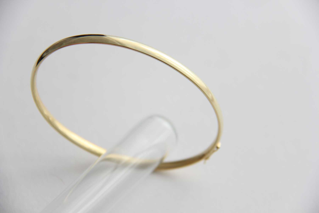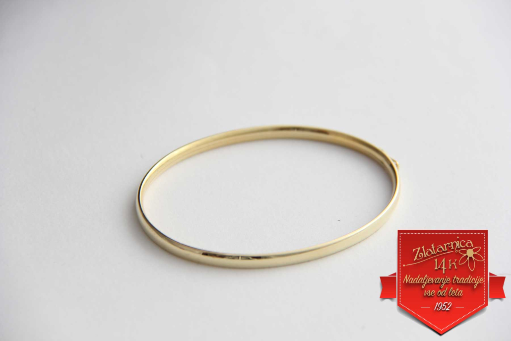 Gladka zapestnica v obliki ovalnega obroča, polkrožnega profila iz rumenega zlata, z varnostno osmico.