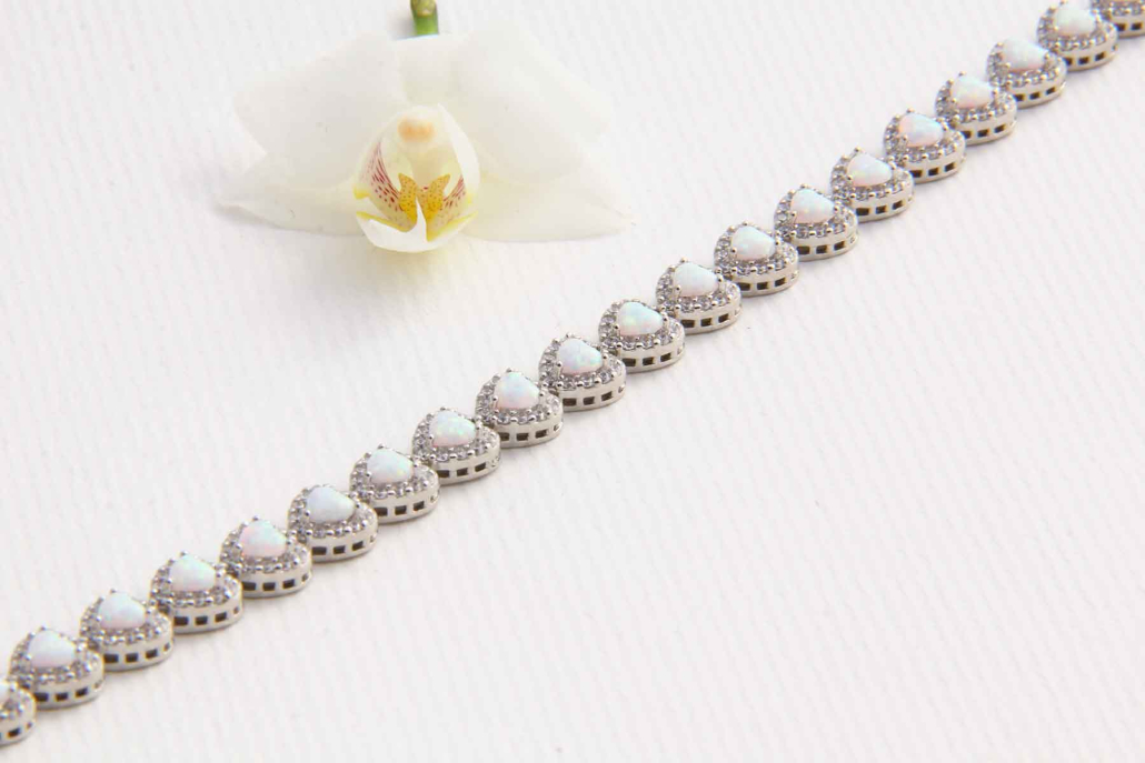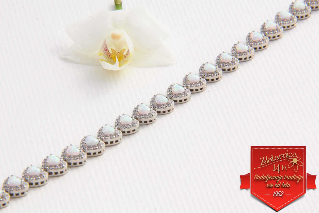 Elegantna zapestnica sestavljena iz ponavljajočih členov v obliki srčkov okovanih s cirkoni in opali.