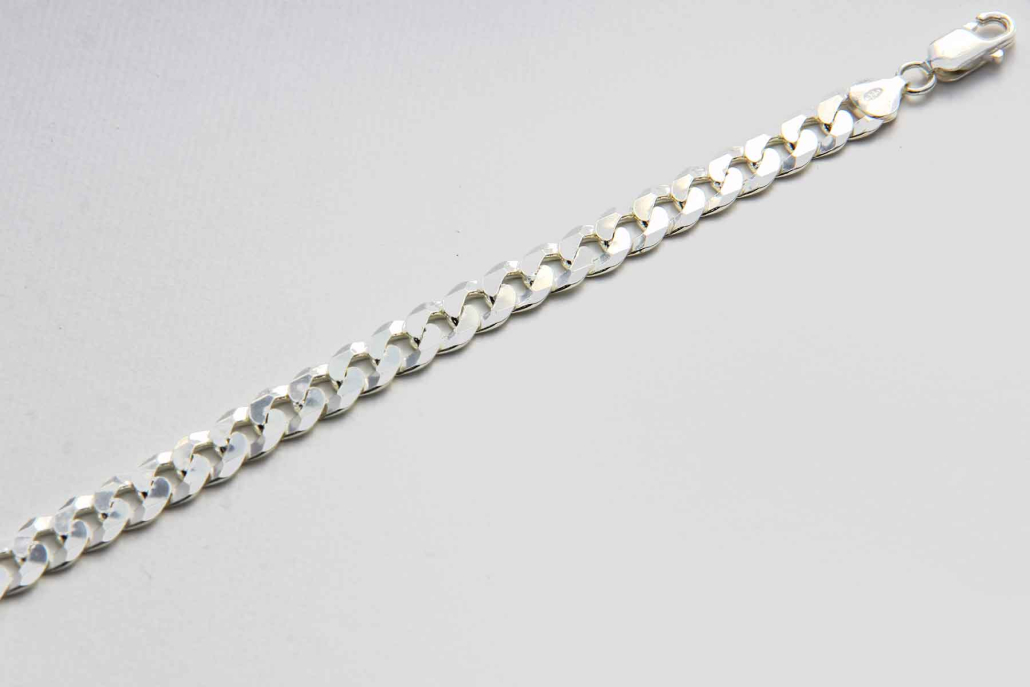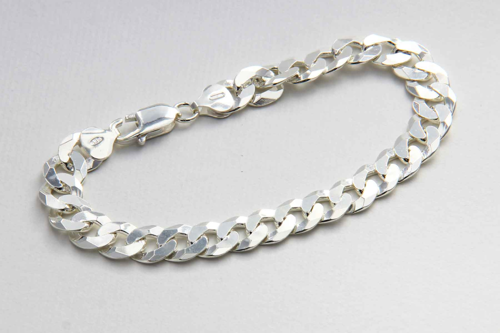 Masivna moška srebrna zapestnica. Členi so povezanimi v ploščati vez pancer.