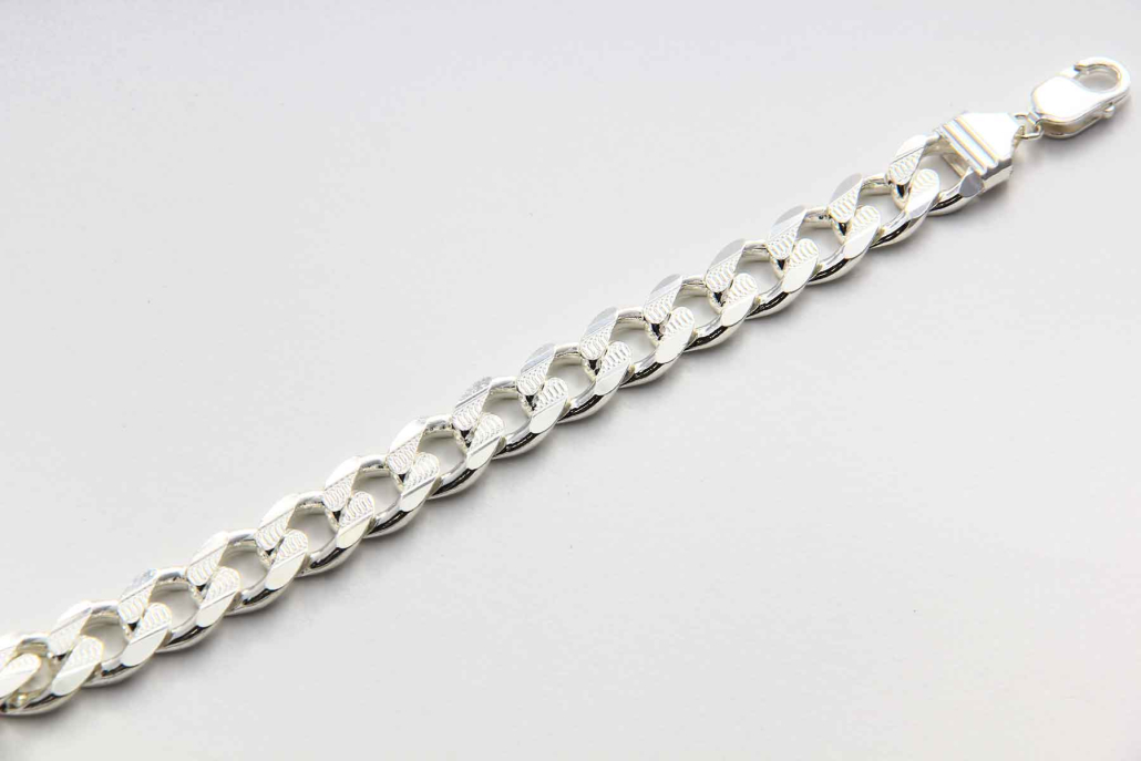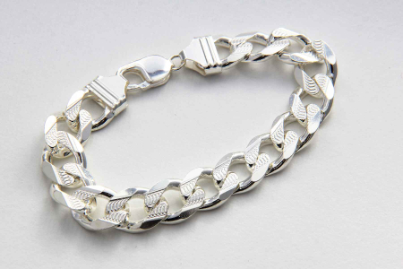 Masivna moška in široka srebrna zapestnica. Členi so povezanimi v ploščati vez pancer z vzorcem.