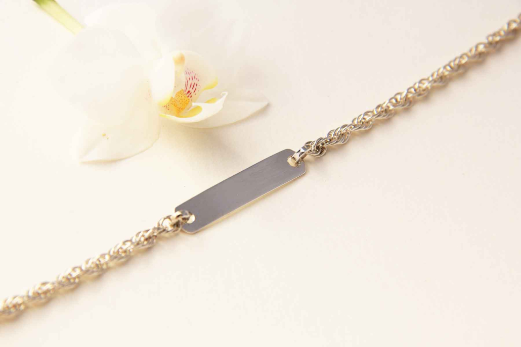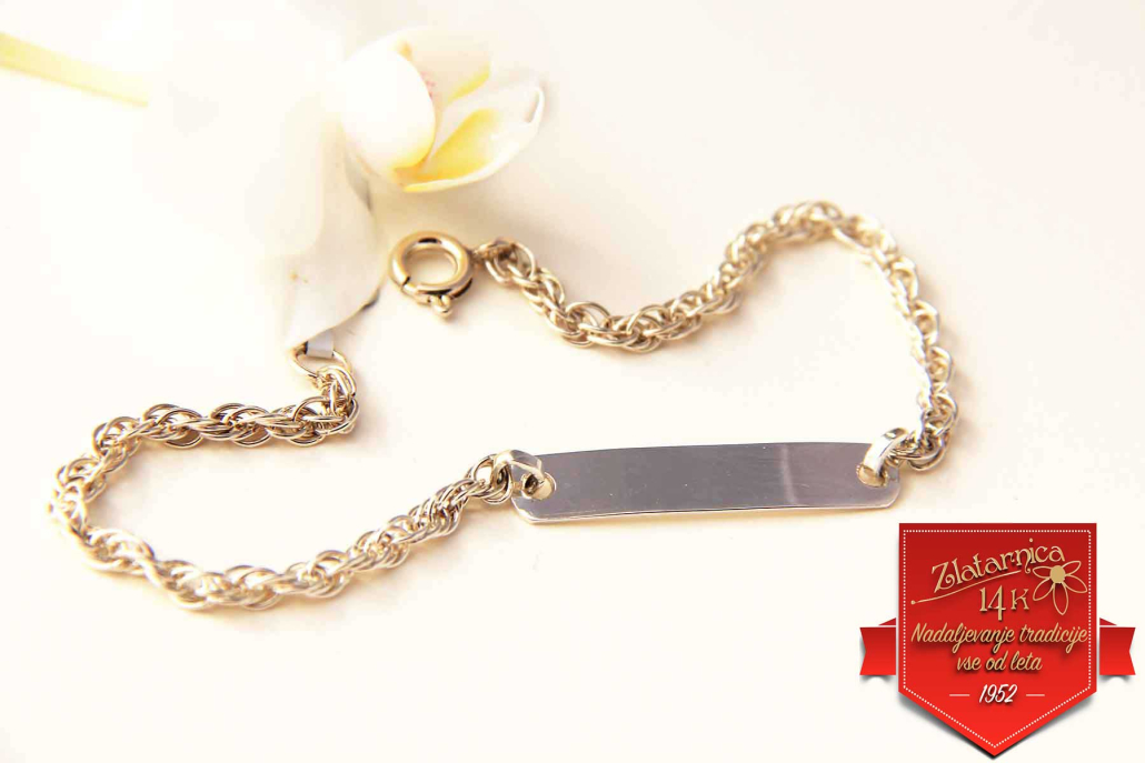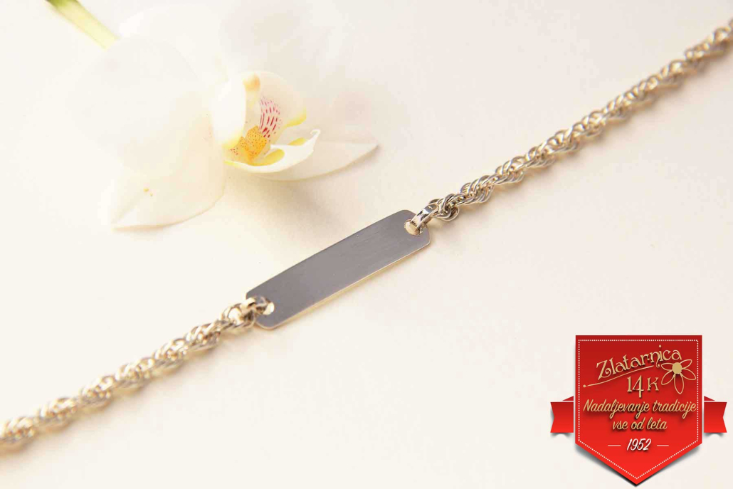 Srebrna ženska zapestnica z napisno ploščico.