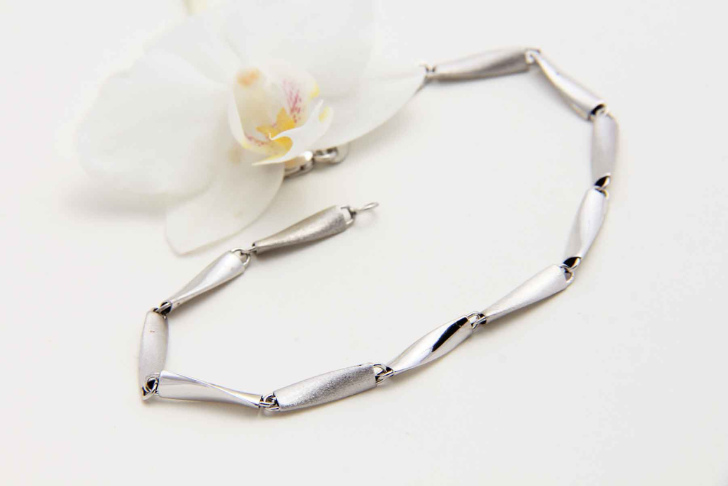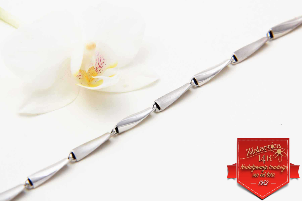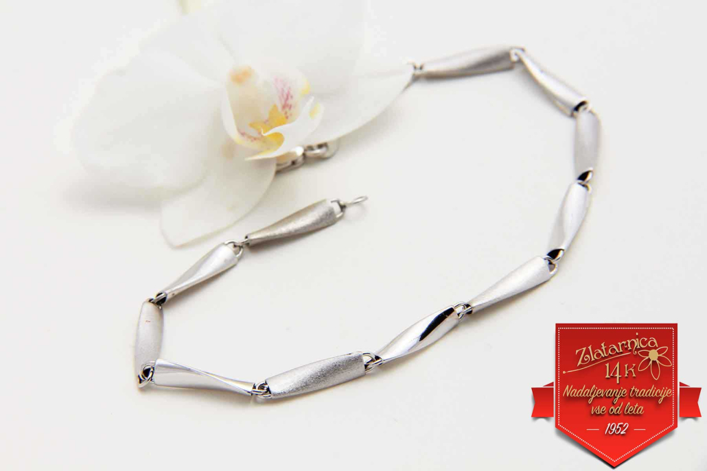 Prefinjena zapestnica iz belega zlata, sestavljena iz zavitih gladkih in matiranih členov.