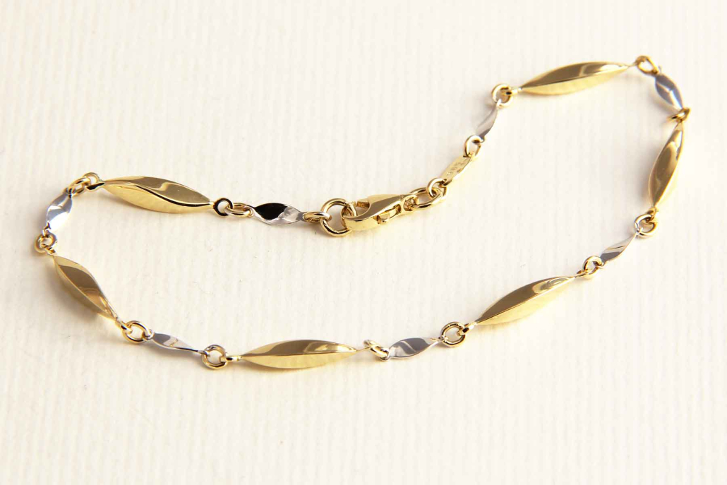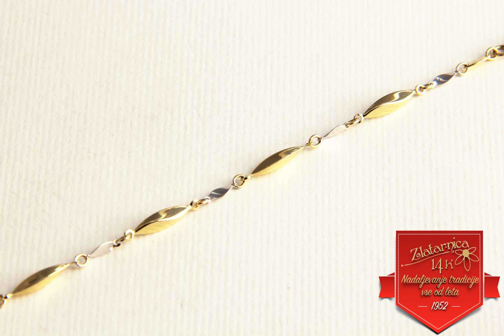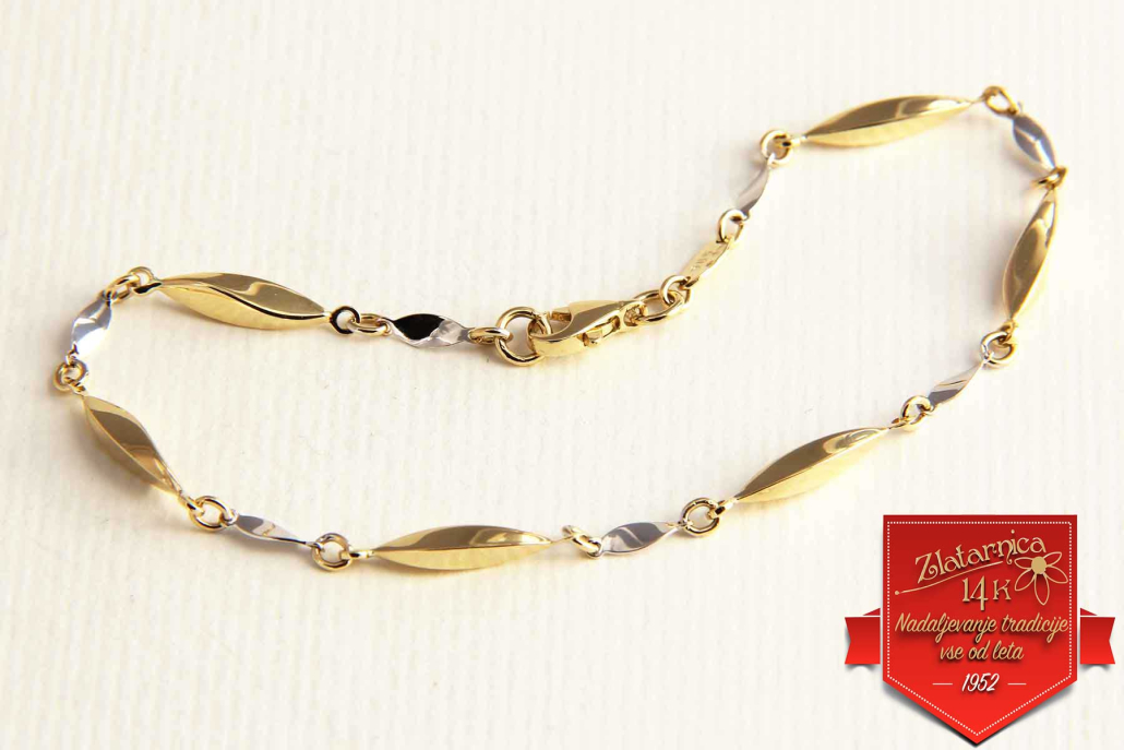 Zapestnica iz kombinacije rumenega in belega zlata.Sestavljena je iz rumenih vzdolžih, zavitih členov in belih manjših ploščic. Zapira se z varnostnim karabinerjem.