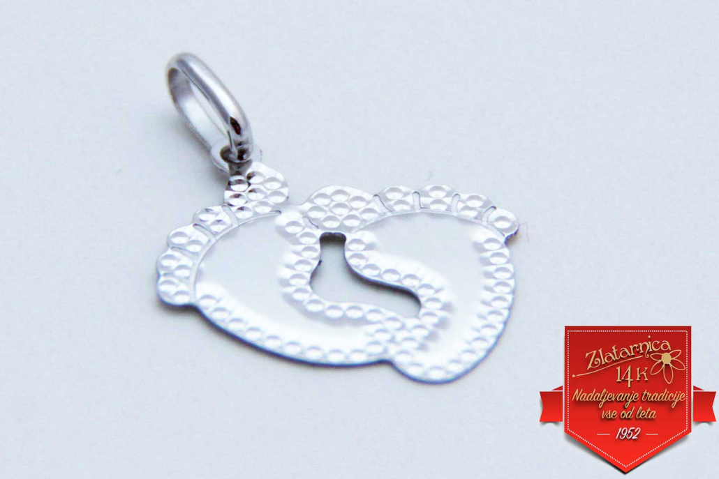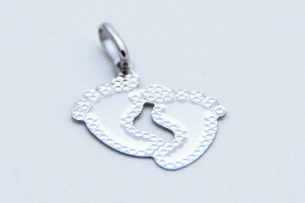 Obesek – motiv odtisa nogic. Idealno darilo ob rojstvu otroka. Možnost graviranja na obeh straneh in obeh nogicah.