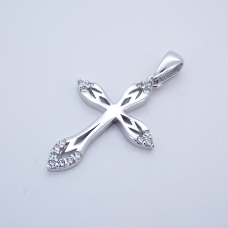 Križ iz rumenega zlata z površino okrašeno s cirkoni.