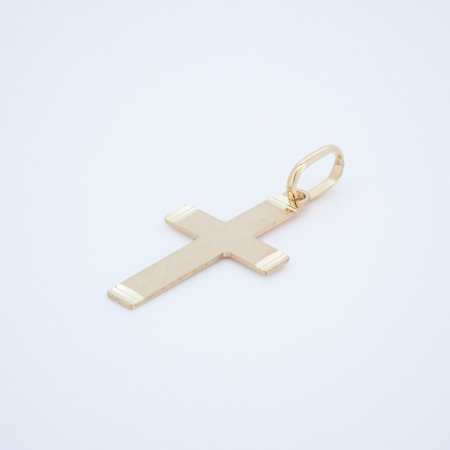 Križ iz rumenega zlata matirane in gladke površine z vtisnjenimi svetlečimi linijami.