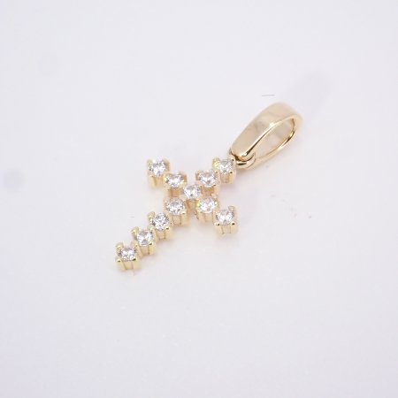 Križ iz rumenega zlata z površino okrašeno s cirkoni.