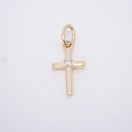 Križ iz rumenega zlata z gladko površino okrašeno s cirkonom.