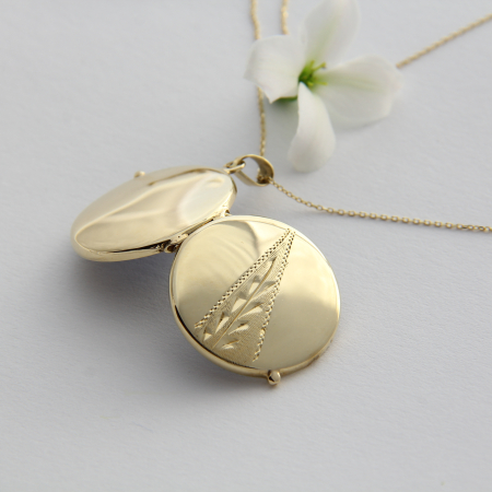 Čudoviti okrogli medaljon z okrasno gravuro spredaj.